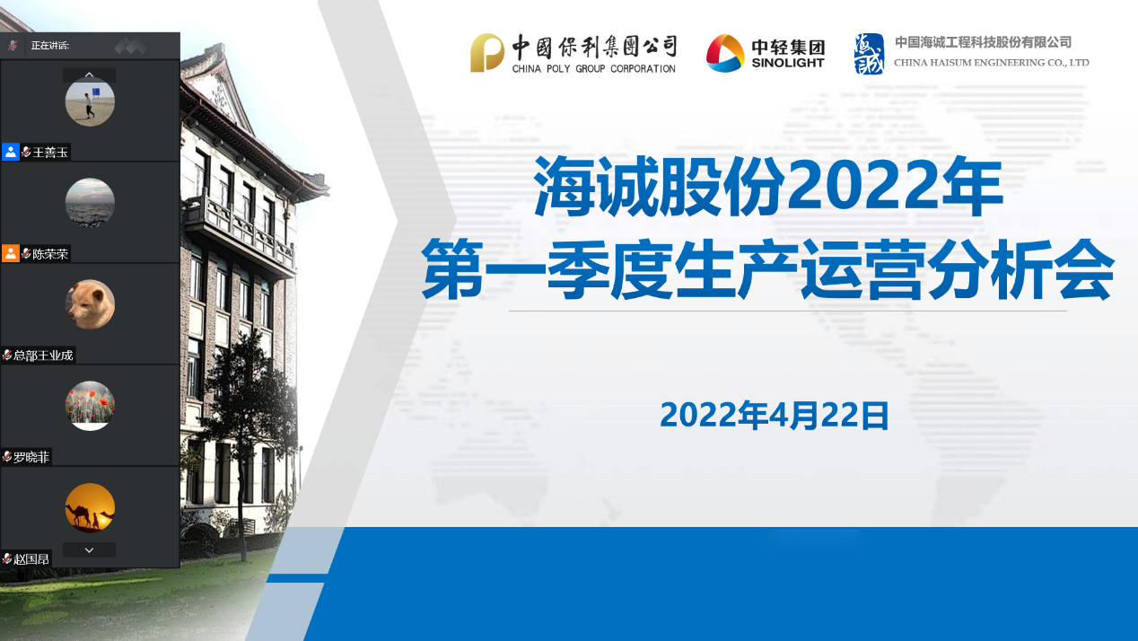 On April 22, China Haisum held the production and operation analysis meeting in the first quarter of 2022 in the form of videoconferencing to thoroughly implement the decision-making and deployment of the symposium convened by Poly Sinolight in the first quarter of 2022, comprehensively summarize the work of the first quarter, and study and deploy key tasks in the next stage. Zhao Guoang, Secretary of the CPC Committee and Chairman of Haisum, attended the meeting via video and delivered a speech. Chen Rongrong, Deputy Secretary of the CPC Committee and President of Haisum, presided over the symposium. The leaders of the Company, the department heads of the headquarters, the leaders of the the Shanghai Business Developments and subsidiaries, and the related personnel from finance, digitalization, production and operation departments attended the meeting at branch venues.