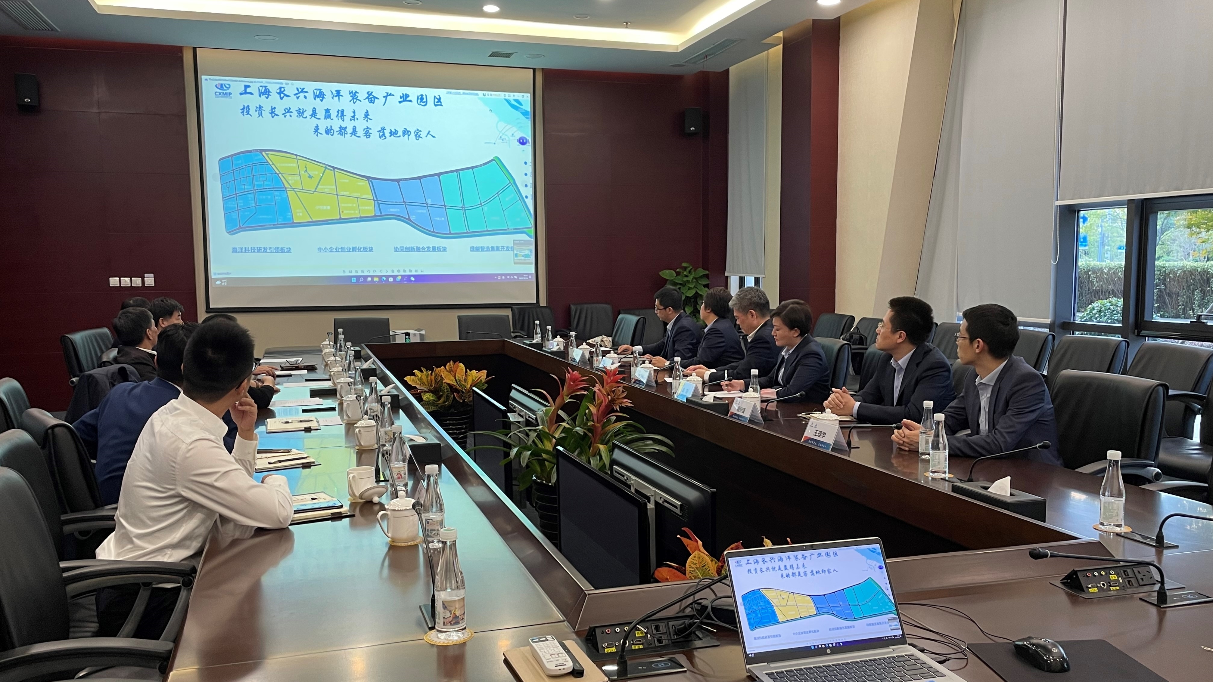 On October 14, at the invitation of Zhang Zhong, Secretary of the CPC Committee and Chairman of Shanghai Changxing Enterprise Group Co., Ltd., Zhao Guo'ang, Secretary of the CPC Committee and Chairman of China Haisum, led a team to visit Shanghai Changxing Marine Equipment Industry Base. Relevant principals of Shanghai Changxing Enterprise Group Co., Ltd., Market Development Center, Technology R&D Center of China Haisum Headquarters and Shanghai head office of China Haisum participated in the symposium and visit.