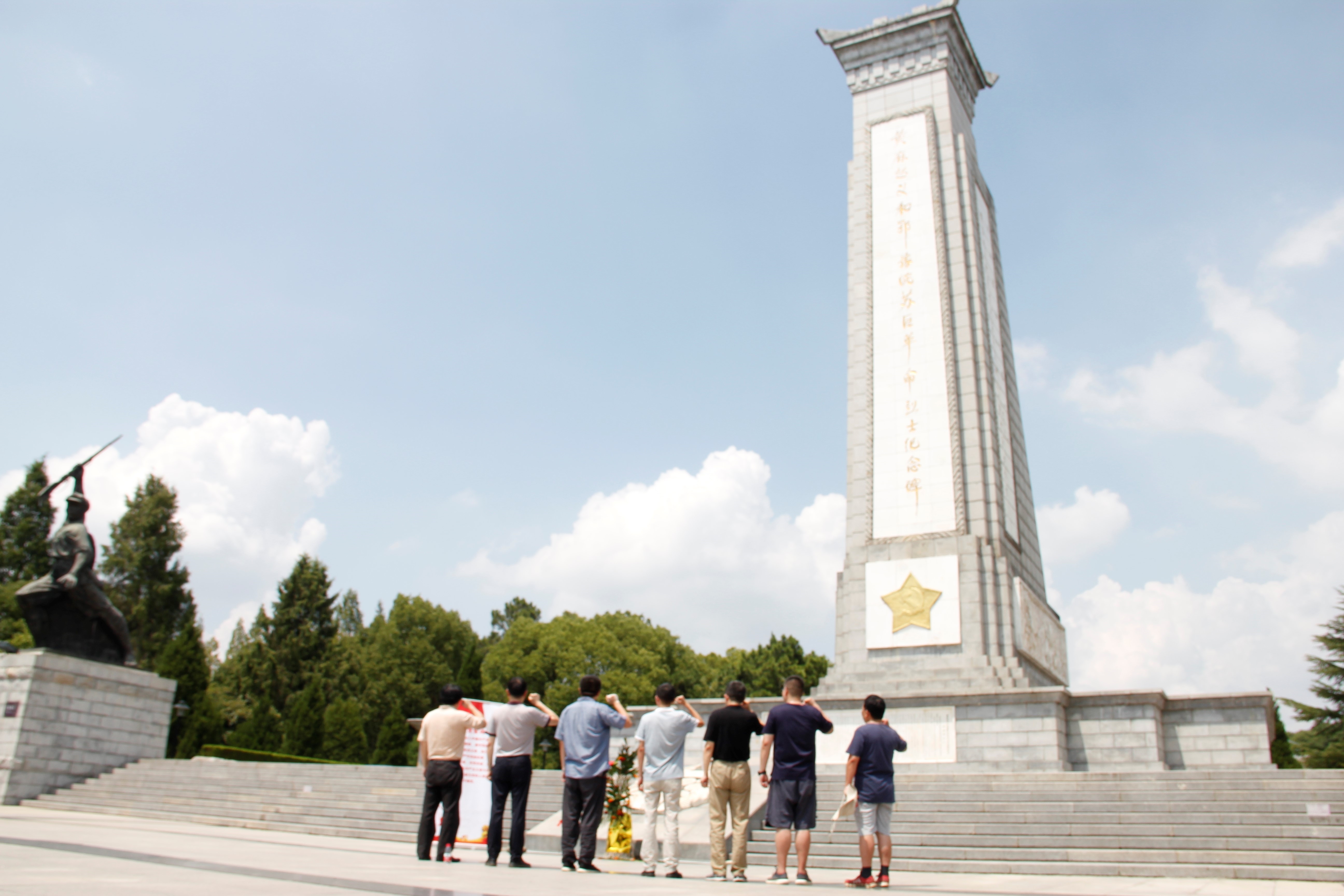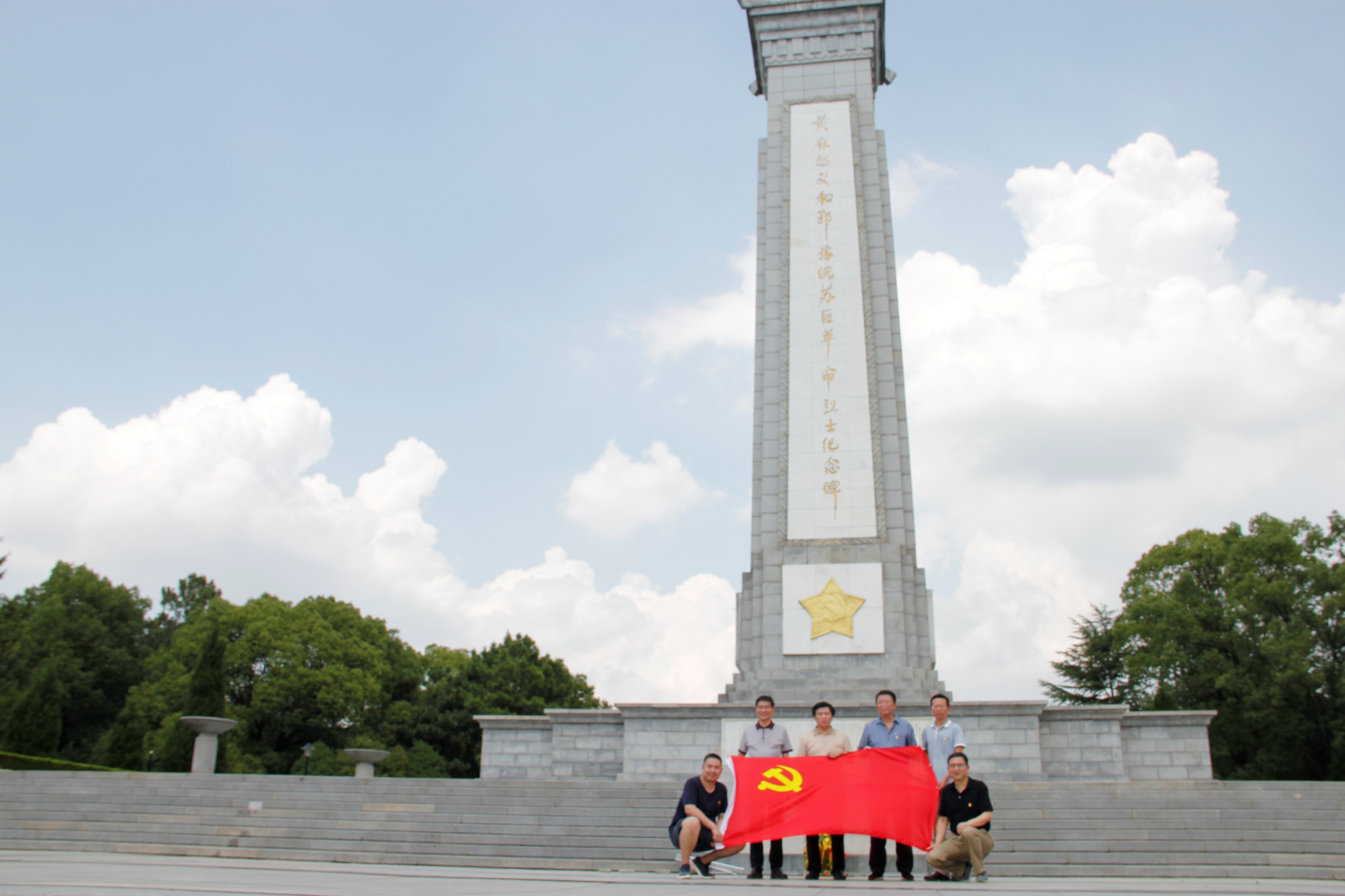同志們?cè)邳S麻起義和鄂豫皖蘇區(qū)烈士紀(jì)念碑前與黨旗合影