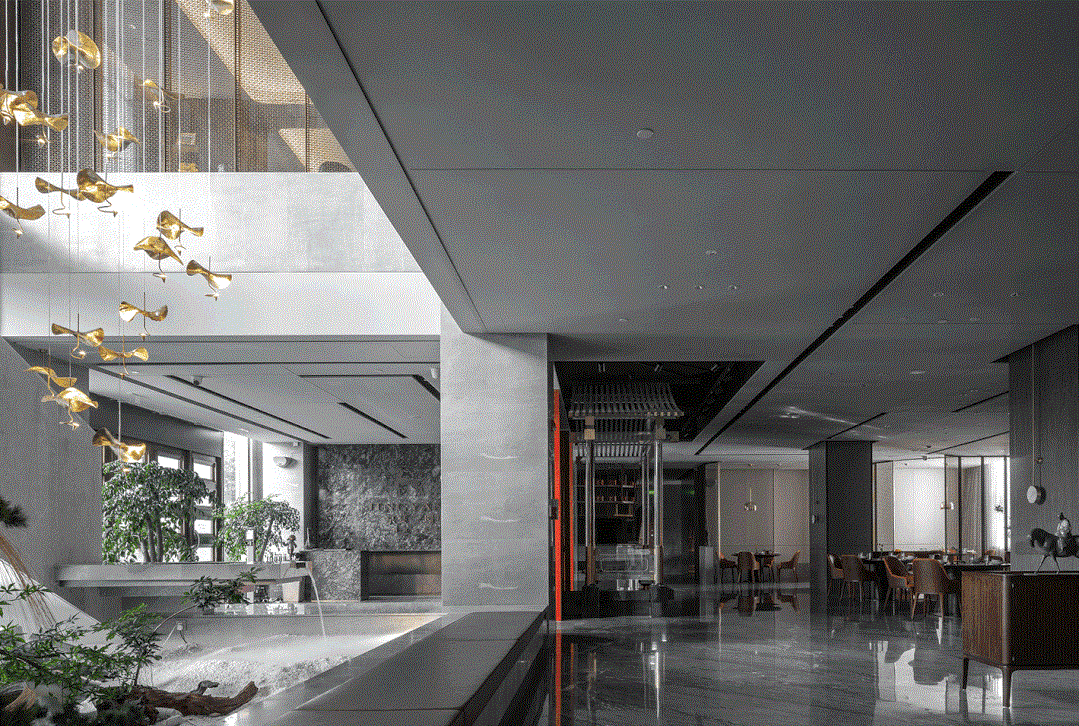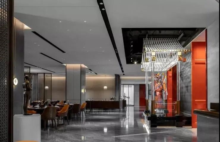在方案設(shè)計(jì)之初,設(shè)計(jì)師希望通過(guò)現(xiàn)代設(shè)計(jì)手法將東方情的世界觀融入整體空間內(nèi),詮釋中國(guó)傳統(tǒng)智慧與生活美學(xué)。大堂背后正對(duì)就餐區(qū)的區(qū)域設(shè)計(jì)師希望通過(guò)中國(guó)傳統(tǒng)古建斗拱現(xiàn)代手法的表達(dá)在此設(shè)置一處戲樓,時(shí)空穿越,舞臺(tái)上撫琴歌唱著的仿佛是從五代時(shí)期韓熙載夜宴上走出的曼妙女子,她輕輕吟唱著傳世今生,在京宴一一上演。