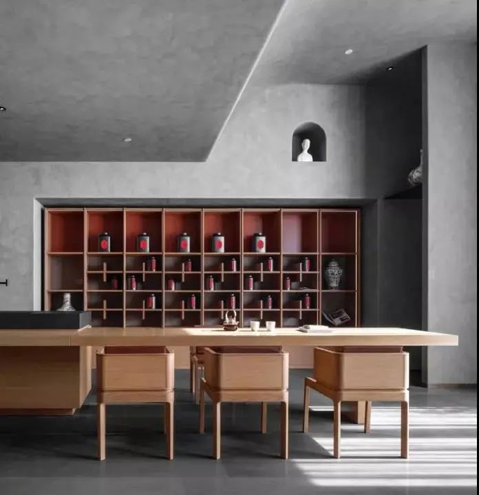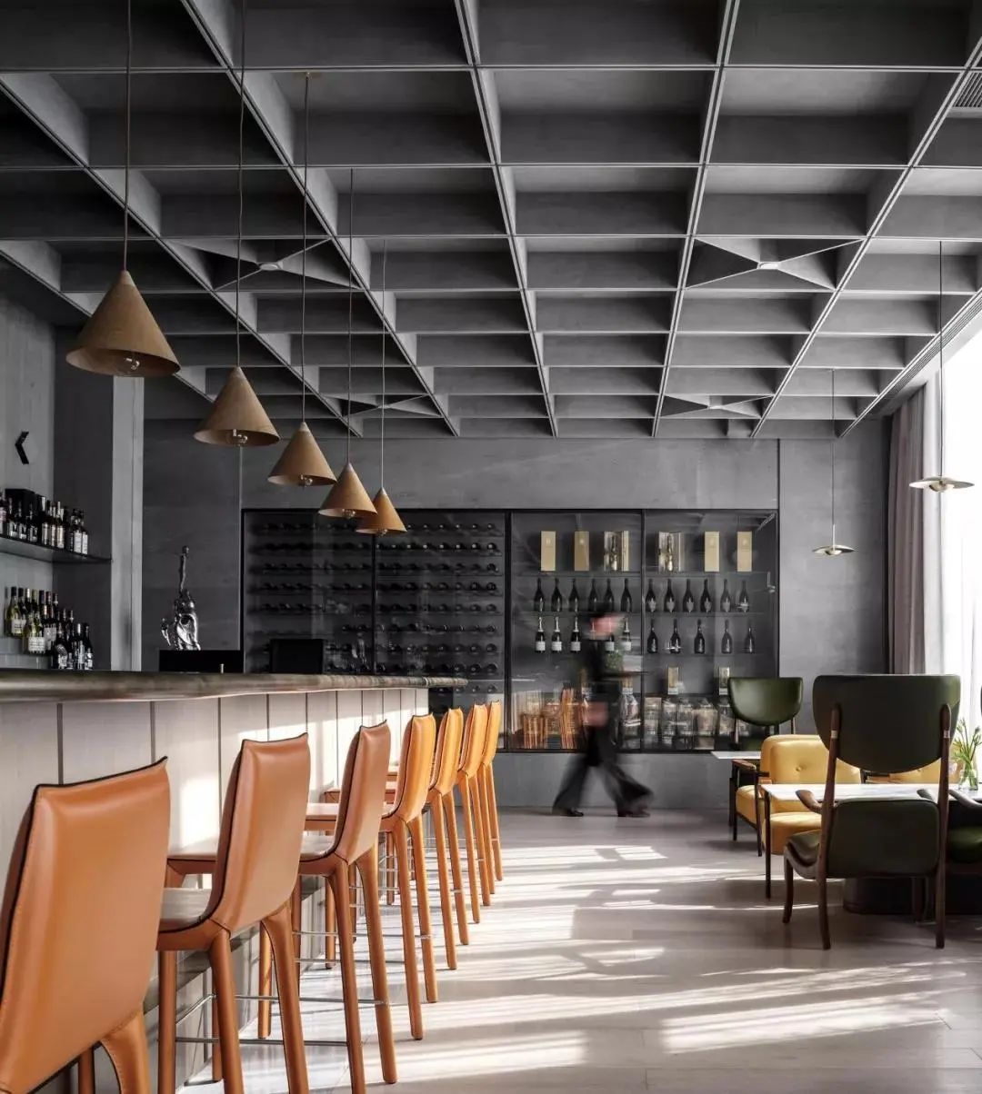進(jìn)餐之后意猶未盡來(lái)到茶室與酒吧區(qū),一改傳統(tǒng)古典的韻味,設(shè)計(jì)師將現(xiàn)代設(shè)計(jì)手法在空間中表現(xiàn)的淋漓盡致,大面積高級(jí)水泥灰色在空間中鋪開(kāi),原木家具的搭配為來(lái)此的客人以溫馨之感,貫穿整個(gè)餐廳的京紅色點(diǎn)綴于此,呼應(yīng)主題展現(xiàn)驚艷之處。