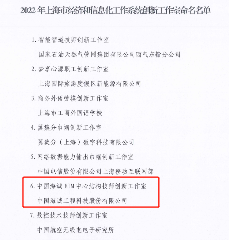 7月12日,上海市經(jīng)濟(jì)和信息化工作系統(tǒng)工會(huì)工作委員會(huì)正式發(fā)布了《關(guān)于命名2022年海市經(jīng)濟(jì)和信息化工作系統(tǒng)創(chuàng)新工作室的決定》,市經(jīng)信系統(tǒng)工會(huì)授予“中國(guó)海誠(chéng)EIM數(shù)創(chuàng)中心結(jié)構(gòu)技師創(chuàng)新工作室”。
