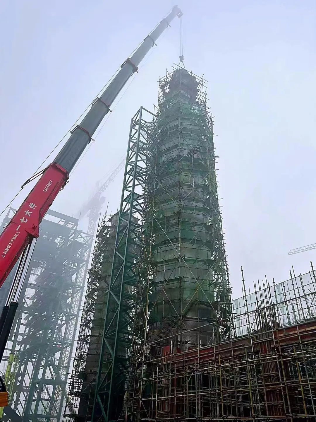 日前,中國海誠所屬中國輕工建設工程有限公司承建的重慶理文項目蒸煮塔順利封頂。此次封頂?shù)恼糁笏删S美德供貨,總高47.9米,底座直徑6米,塔體最小直徑2.6米,塔體總重144噸。設計壓力0.7MPa,工作壓力0.51MPa,工作溫度158℃,容積792m³,塔體材質為S23043雙相不銹鋼,最大厚度26mm。