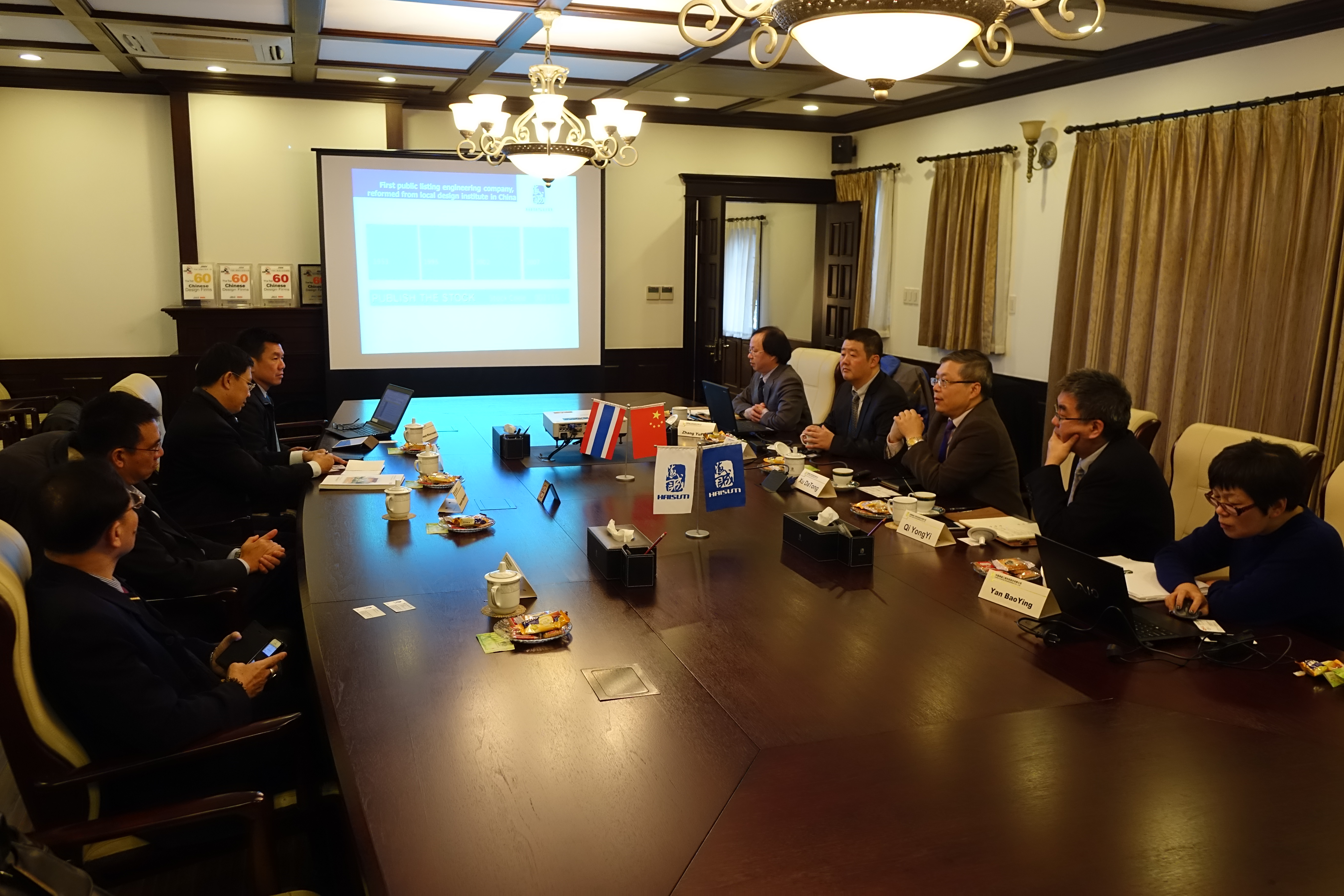 1月30日,海誠股份總裁徐大同、副總裁戚永宜接待了泰國(guó)SCG集團(tuán)總裁Roongrote Rangsiyopash等一行,陪同接待的還有第三設(shè)計(jì)/工程部的相關(guān)人員。