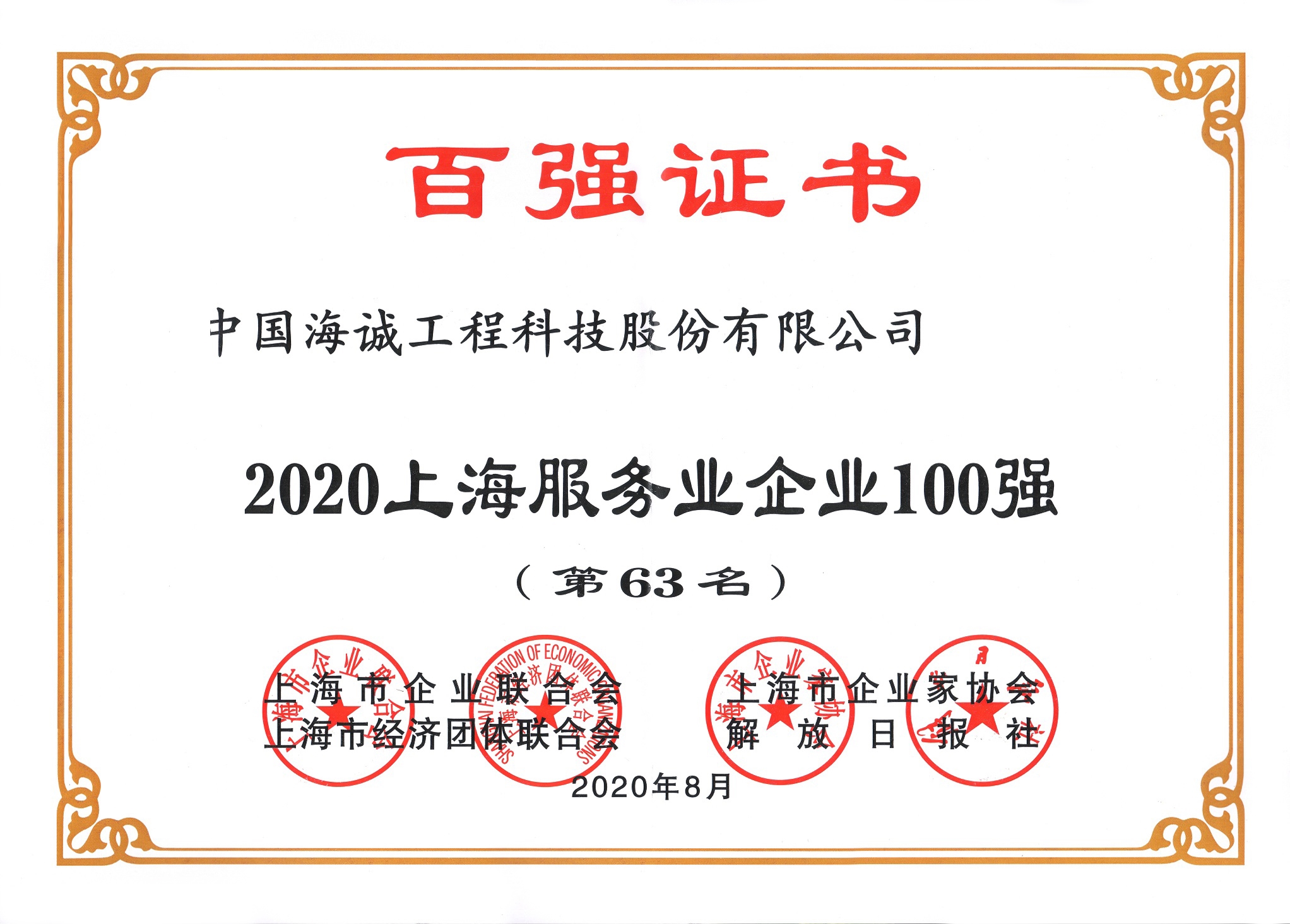 8月18日,由上海市企業(yè)聯(lián)合會、上海市企業(yè)家協(xié)會、上海市經(jīng)濟團體聯(lián)合會、解放日報社聯(lián)合主辦的“2020上海百強企業(yè)發(fā)布會”在滬舉辦。會上發(fā)布了“2020上海服務(wù)業(yè)企業(yè)100強”等榜單。海誠股份再次入圍“2020上海服務(wù)業(yè)企業(yè)100強”,排名第63位。