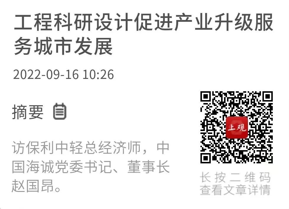 《工程科研設計促進產業(yè)升級服務城市發(fā)展——訪保利中輕總經濟師,中國海誠黨委書記、董事長趙國昂》
