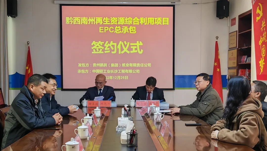 12月26日,中國海誠所屬中國輕工業(yè)長沙工程有限公司(以下簡稱長沙公司)與貴州鵬昇(集團(tuán))紙業(yè)有限責(zé)任公司舉行黔西南州再生資源綜合利用總承包合同簽訂儀式。中國海誠黨委副書記、總裁陳榮榮,副總裁陳志明,貴州鵬昇黨委書記、董事長皮祖喬等雙方領(lǐng)導(dǎo)出席儀式。長沙公司黨委書記、董事長謝顯國代表總承包方在合同上簽字。