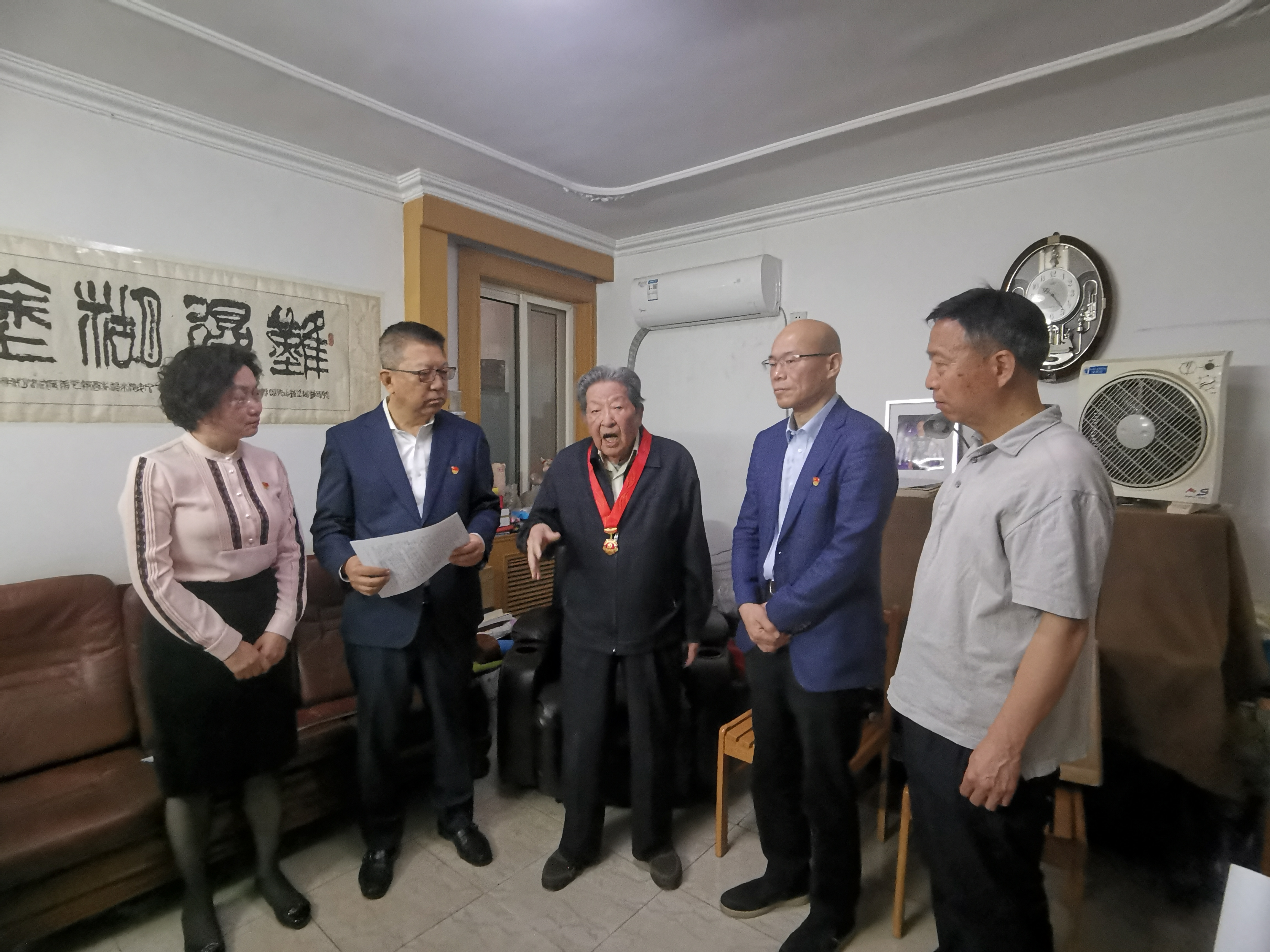 6月18日上午,劉軍才、張萬順、郭建全、曹文素一行前往73年黨齡的趙金生老先生家中慰問。1948年,趙老在東北民主聯(lián)軍六隊警衛(wèi)營行軍舟戰(zhàn)斗中立大功一次;1949年,在四野43軍司令部四連南下行軍中立功一次;建國后,遠赴朝鮮參加抗美援朝戰(zhàn)爭。劉軍才一行仔細觀摩趙老獲得的多枚紀念章,對他為黨的解放事業(yè)和新中國建設所做的貢獻表示感謝。