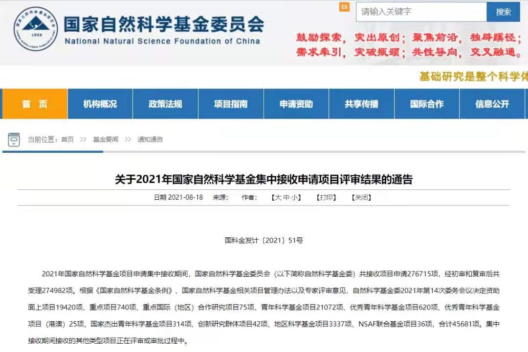 近日,國(guó)家自然科學(xué)基金委員會(huì)發(fā)布《關(guān)于2021年國(guó)家自然科學(xué)基金集中接收申請(qǐng)項(xiàng)目評(píng)審結(jié)果的通告》(國(guó)科金發(fā)計(jì)〔2021〕51號(hào)),保利中輕所屬兩家研究院獲批2個(gè)國(guó)家自然科學(xué)基金項(xiàng)目。