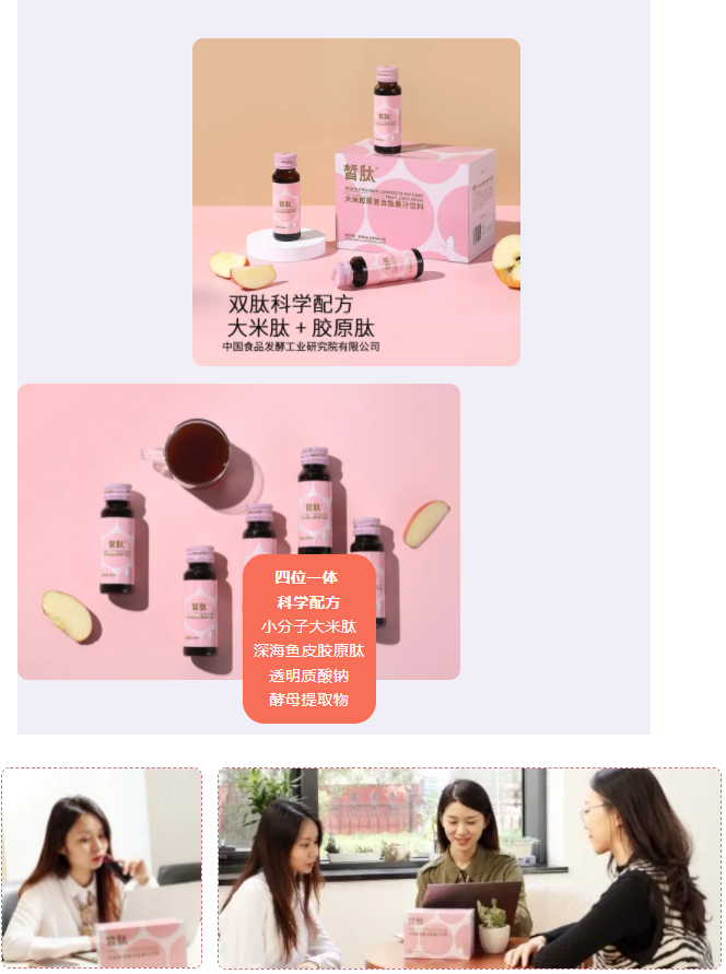 “皙肽”系列產(chǎn)品由保利中輕所屬中國食品研究院自主研發(fā)生產(chǎn),大米膠原復(fù)合肽果汁飲料以大米肽和自有專利提取的深海魚皮膠原肽為核心原料,雙肽科學(xué)配方,解決肌膚暗沉、干燥粗糙、彈性降低等肌膚問題,經(jīng)過專業(yè)檢測認證,安全放心;中國食品研究院專家團隊匠心研發(fā),經(jīng)過長期追蹤試飲反饋,肌膚問題明顯改善。