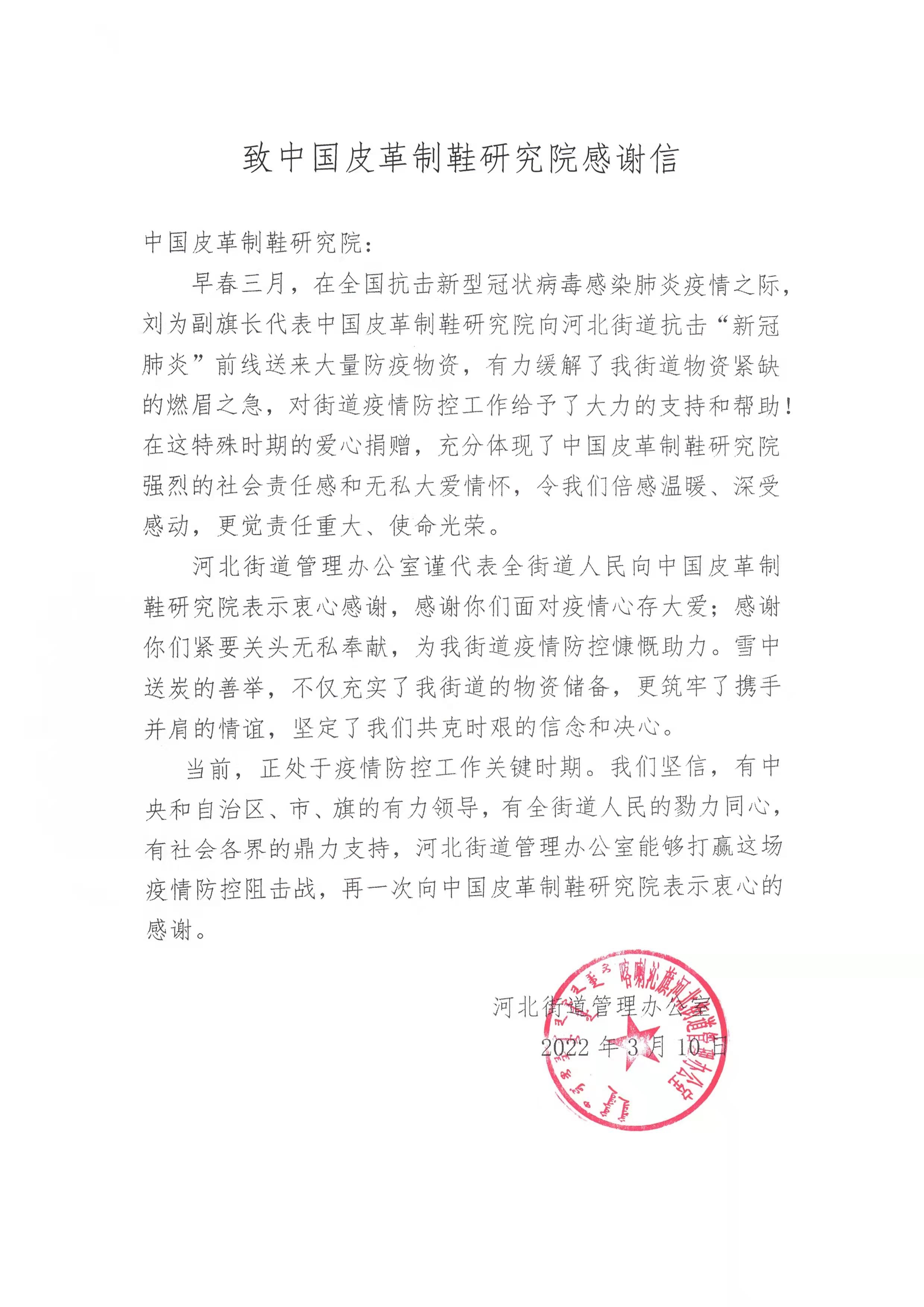 為助力內(nèi)蒙古喀喇沁旗渡過疫情難關(guān),中國(guó)皮革制鞋研究院向喀喇沁旗河北街道捐贈(zèng)了400套防護(hù)服,并收到河北街道發(fā)來的感謝信。