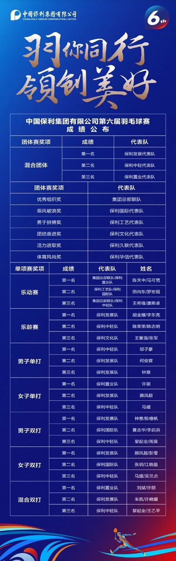 保利中輕代表隊由保利中輕副總經(jīng)理、總會計師段趙清帶隊,由選拔自子公司的12名運動員組成。本次比賽中,保利中輕羽球健兒奮勇拼搏、超越自我,斬獲了優(yōu)良戰(zhàn)績。