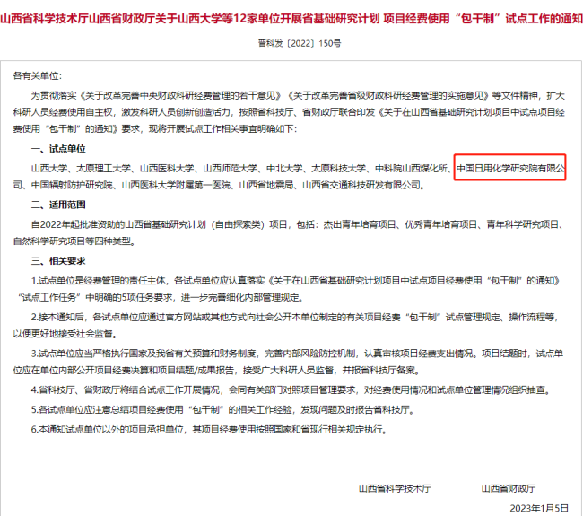 中國日用化學(xué)研究院獲批成為山西省基礎(chǔ)研究計劃項目經(jīng)費使用“包干制”試點單位 。中國日用化學(xué)研究院將以此為契機,加大科研投入,激發(fā)科研人員創(chuàng)造活力,不斷提升創(chuàng)新能力。