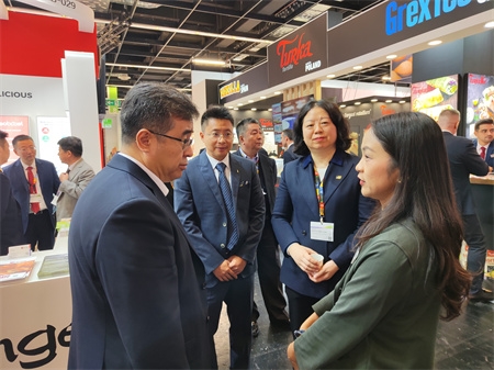 展臺首日即吸引了來自歐亞等產(chǎn)業(yè)鏈上下游參展企業(yè)和觀眾的持續(xù)關(guān)注。保利集團(tuán)總經(jīng)理助理,保利中輕黨委書記、董事長安勝杰來到中國食品發(fā)酵工業(yè)研究院展臺,親切慰問參展員工,并前往安琪酵母、加拿大Saputo乳業(yè)公司、法國SILL SAS集團(tuán)、荷蘭Salud Foodgroup Europe BV等相關(guān)展臺進(jìn)行交流,與世界食品博覽會(Anuga)主辦方就未來有關(guān)合作進(jìn)行交流,并接受主辦方專題采訪。