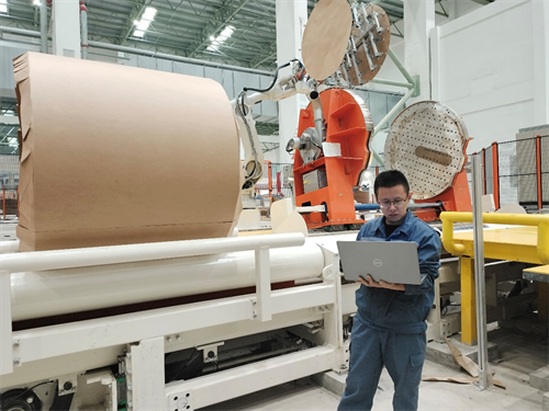 在馬來(lái)西亞玖龍項(xiàng)目的紙卷輸送包裝車(chē)間,一位工作人員正在通過(guò)電腦連接生產(chǎn)線進(jìn)行調(diào)試。他注意力高度集中,根據(jù)紙卷包裝運(yùn)行狀態(tài)有條不紊地調(diào)整著各項(xiàng)參數(shù),很快地,一個(gè)個(gè)紙卷像聽(tīng)懂了他的命令一般,整齊有序地依次排隊(duì)入庫(kù)……
