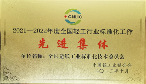 中國制漿造紙研究院榮獲“2021-2022年度全國輕工行業(yè)標(biāo)準(zhǔn)化工作先進(jìn)單位”稱號(hào);作為秘書處承擔(dān)單位運(yùn)營的全國造紙工業(yè)標(biāo)準(zhǔn)化委員會(huì)榮獲“2021—2022年度全國輕工行業(yè)標(biāo)準(zhǔn)化工作先進(jìn)集體”稱號(hào)。