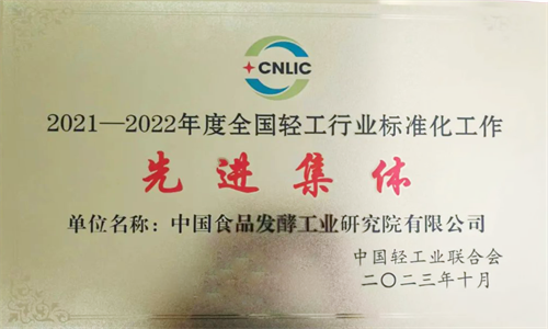 中國食品發(fā)酵工業(yè)研究院榮獲“2021-2022年度全國輕工行業(yè)標(biāo)準(zhǔn)化工作先進(jìn)集體”稱號(hào)。