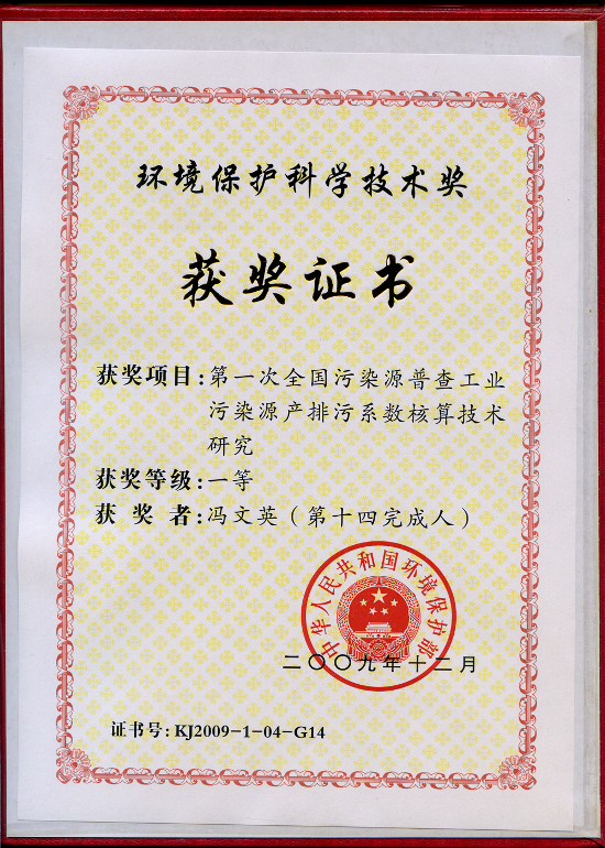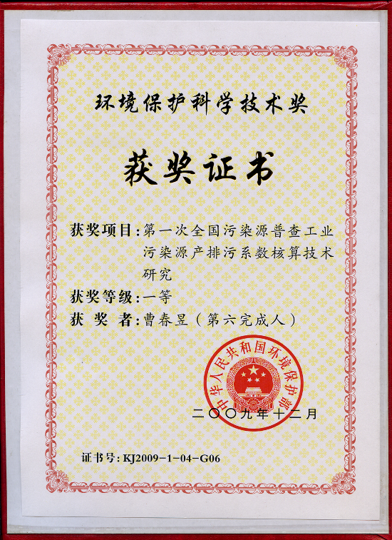 中國制漿造紙研究院教授級高工曹春昱和高工馮文英參與的《第一次全國污染源普查工業(yè)污染源產(chǎn)排污系數(shù)核算技術(shù)研究》項(xiàng)目獲國家環(huán)保部2009年度環(huán)境保護(hù)科學(xué)技術(shù)獎(jiǎng)一等獎(jiǎng)。