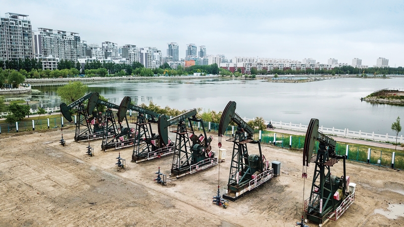 經(jīng)過半個(gè)多世紀(jì)艱苦創(chuàng)業(yè),大慶油田不僅扛起了“共和國加油機(jī)”的神圣職責(zé),為保障國家能源安全作出巨大貢獻(xiàn),而且著力打造了一座人與自然和諧相處、原油生產(chǎn)與環(huán)境保護(hù)相得益彰的“綠色油化之都”。圖為大慶油田叢式井坐落在市區(qū)燕都湖旁。 新華社記者 王建威/攝